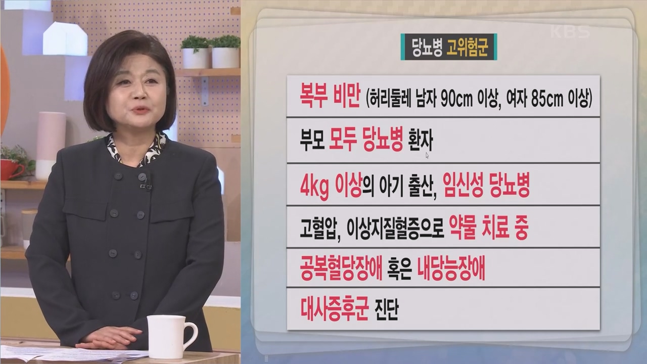 당뇨병 고위험군은 허리둘레가 남자 90cm 이상, 여자 85cm 이상인 복부비만, 부모 모두 당뇨병 환자인 가족력, 4kg 이상의 아기 출산, 임신성 당뇨병, 고혈압, 이상지질혈증으로 약물 치료중이거나 공복혈당장애 혹은 내당능장애, 다사증후군 진단을 받은 분들이 당뇨병 고위험군이라고 합니다.